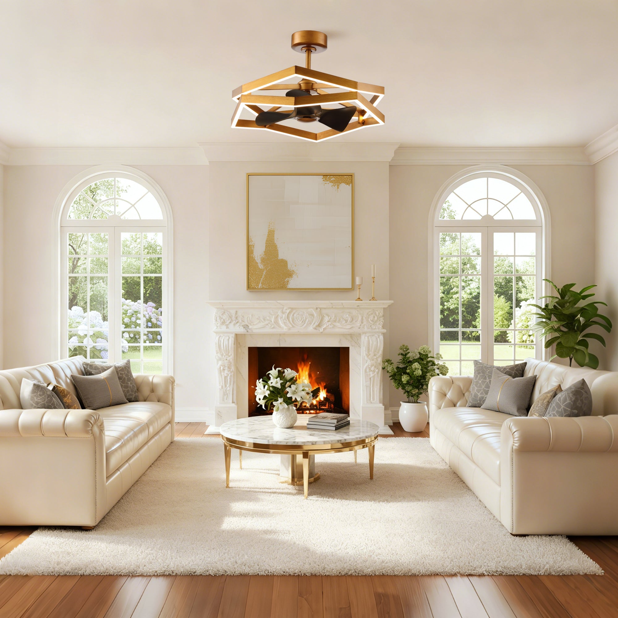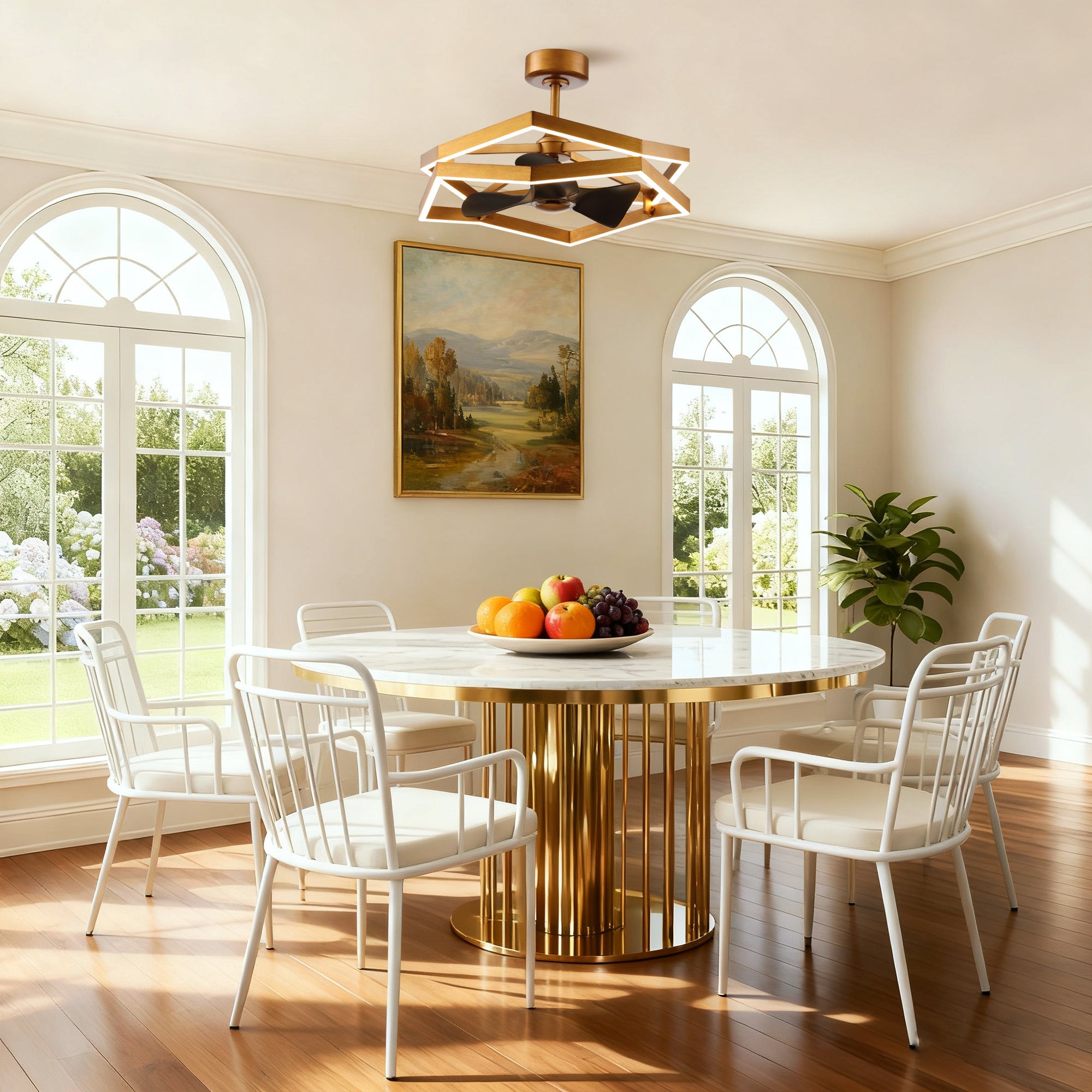 Efficiently cool and stylishly illuminate your space with this antique golden caged ceiling fan with light, combining powerful airflow with customizable, dimmable lighting.