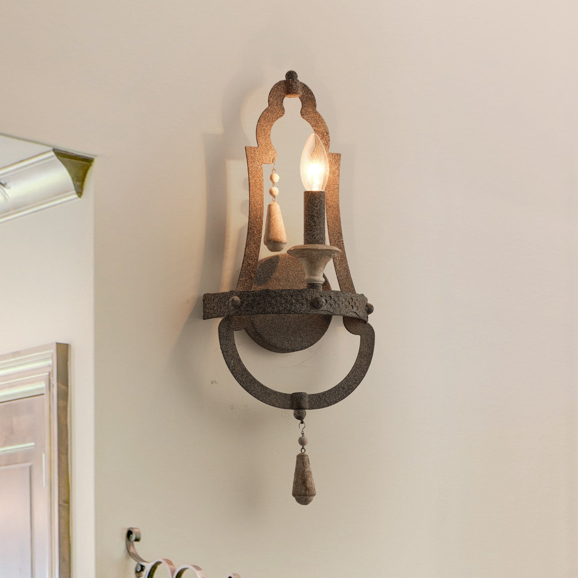 This 1-light rustic wall sconce is perfect for every room in your home. Crafted from solid wood and wrought iron, this wall sconce projects a warm, ambient light that's perfect for bathrooms, hallways, staircases, and foyers.
